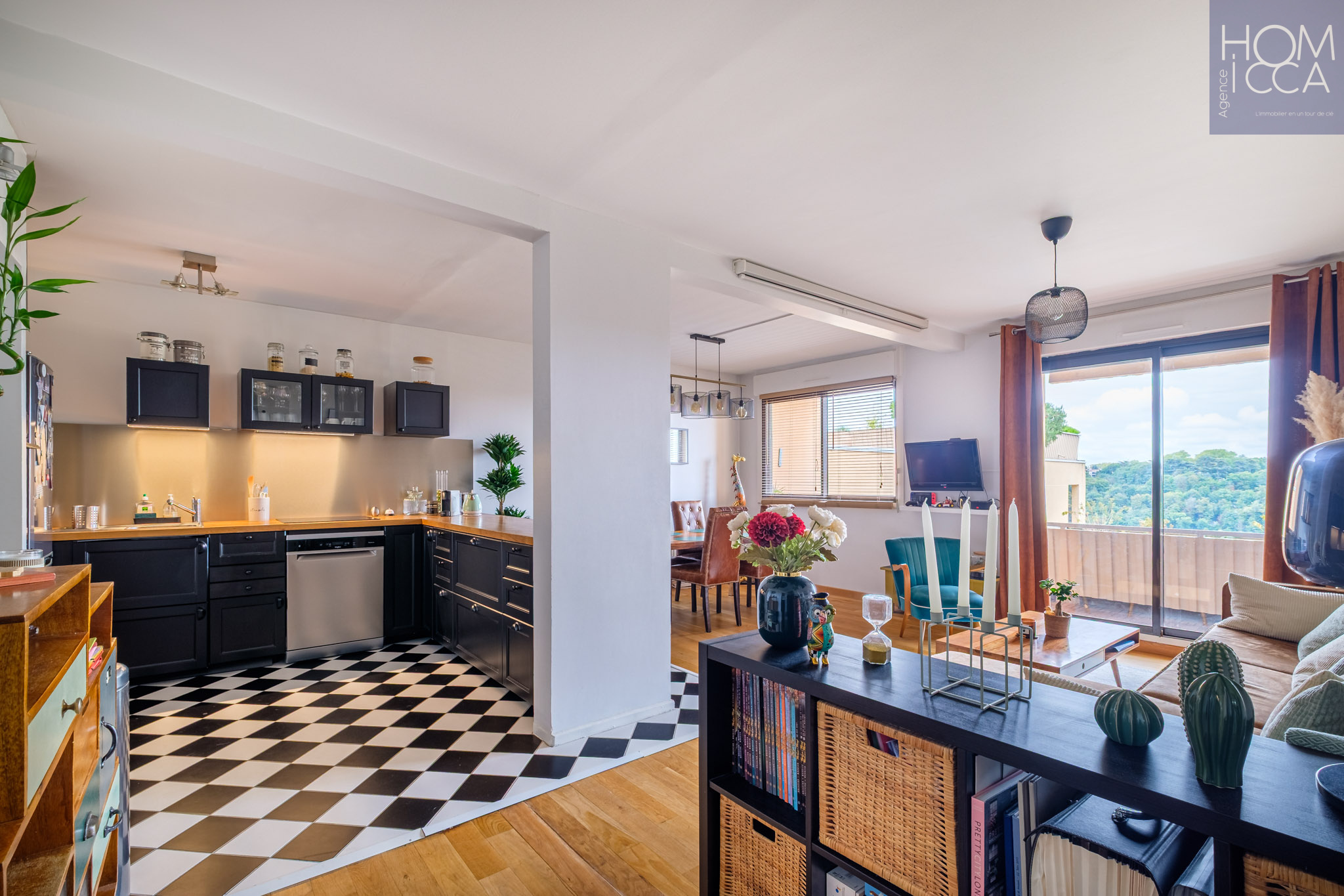 Un hall d'entrée équipé d’un placard mène à une superbe pièce de vie de 34 m², baignée de lumière, avec sa cuisine meublée et équipée ouverte sur le séjour donnant sur un balcon à vivre de 8,35 m² exposé plein Sud.