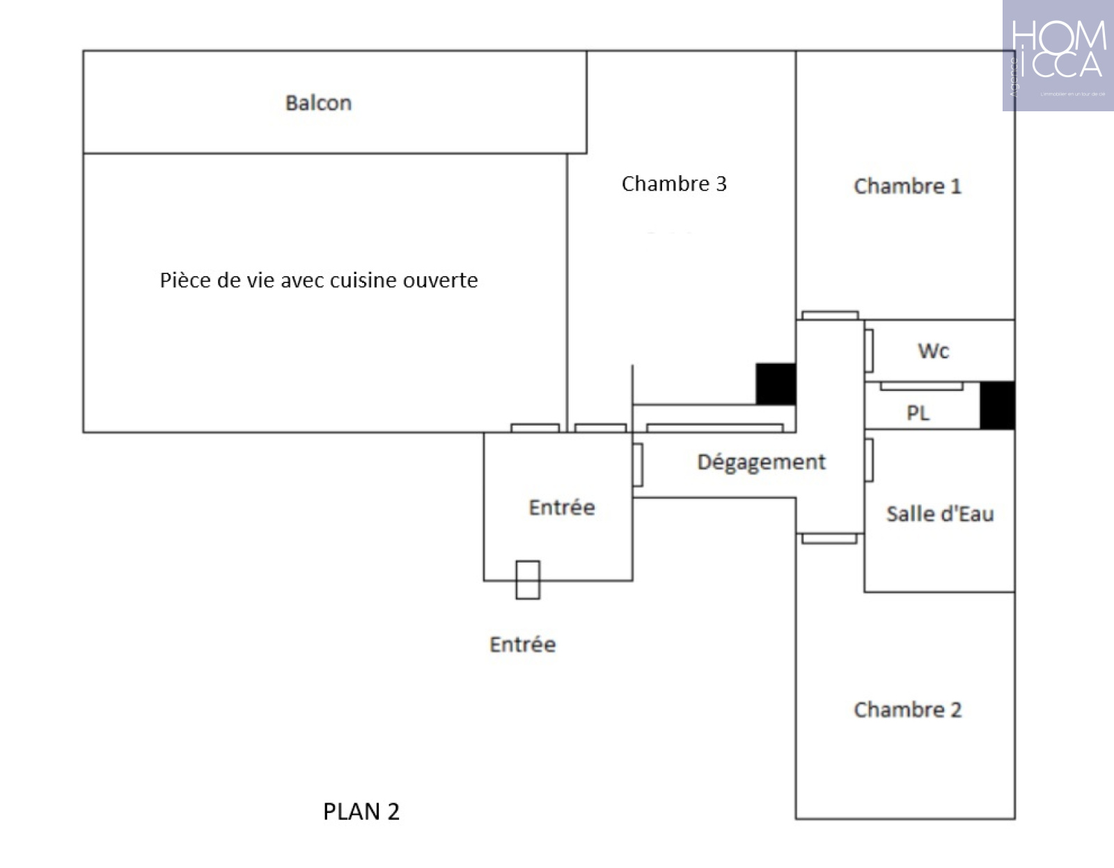 Il est possible de le réagencer : la cuisine peut être intégrée dans la pièce de vie. Elle devient ainsi la 3ème chambre (14m2) de l'appartement avec accès balcon (plan 2).