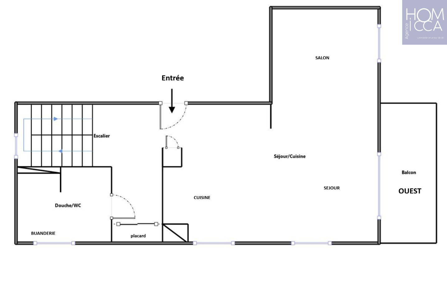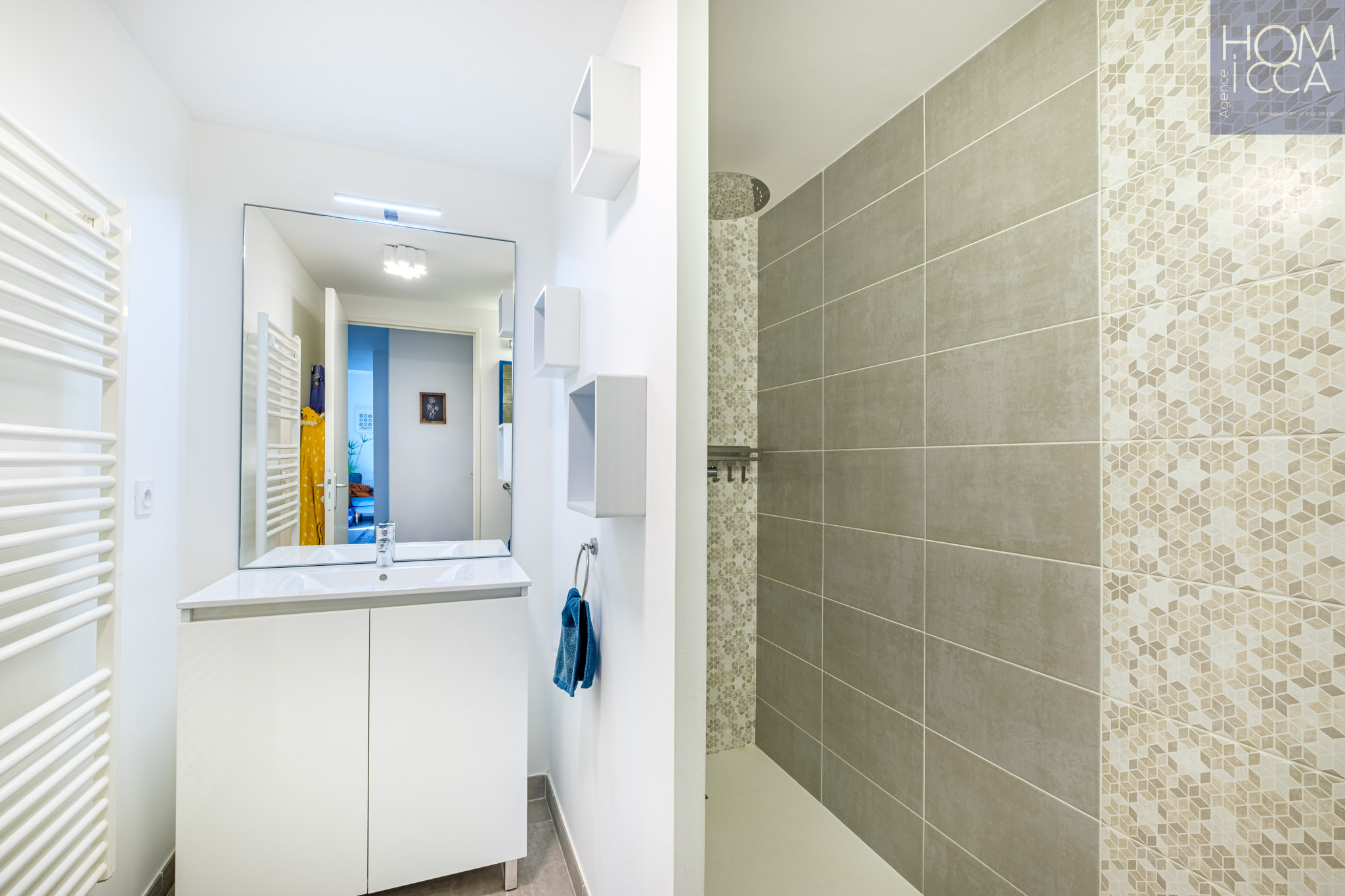 Au niveau zéro, de plain pied, une entrée aménagée avec un grand placard mural, ouverte sur une grande pièce de vie lumlneuse réunissant le salon, la salle à manger et la cuisine ouverte entièrement équipée, le tout avec un accès direct au grand balcon couvert exposé à l'Ouest et bénéficiant d'une agréable vue sur le Parc du Vallon. Au même niveau, se trouve une salle d'eau avec une douche, des toilettes suspendus et un espace buanderie.