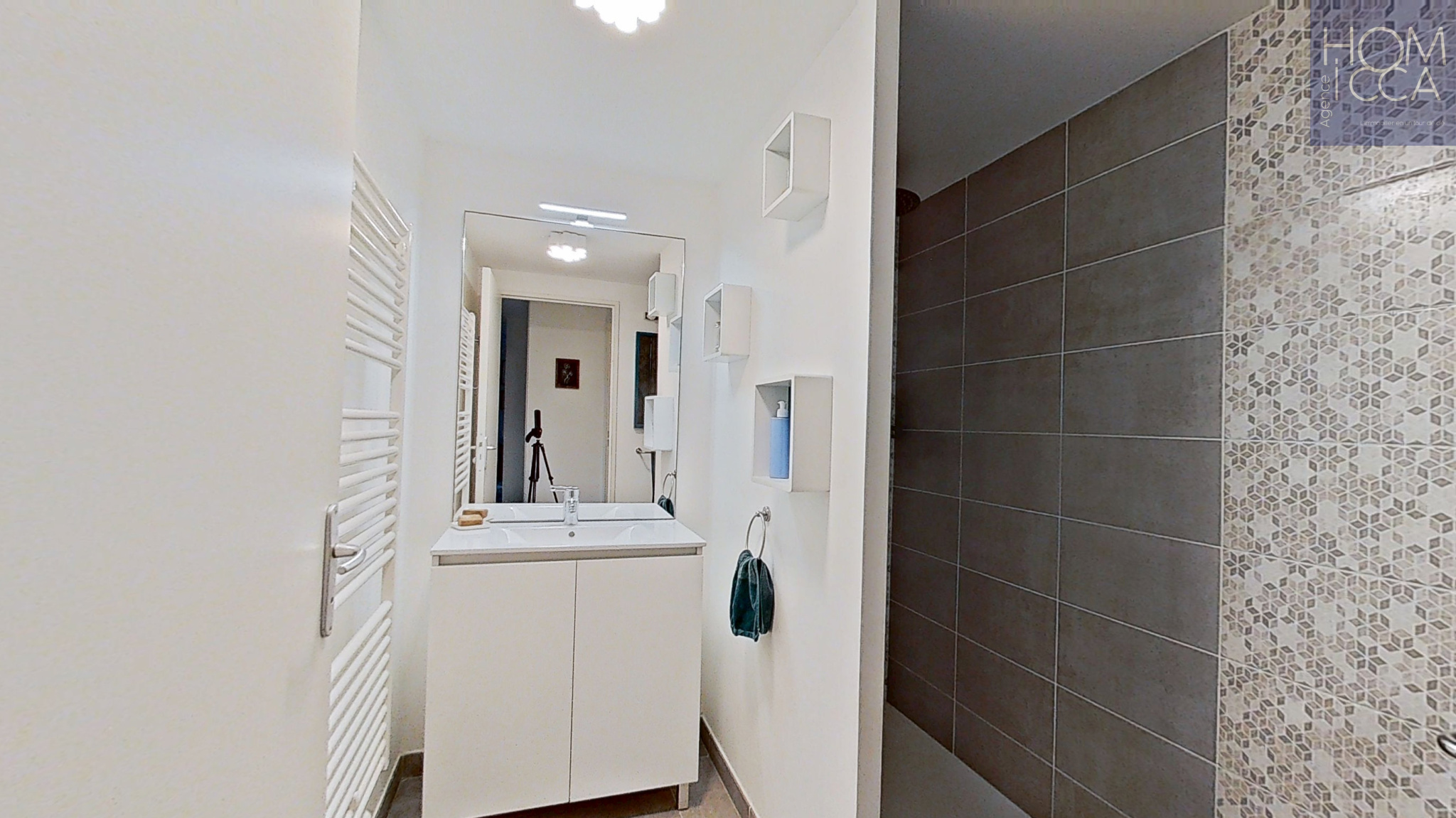 Au rez de chaussée, une entrée aménagée avec un grand placard mural, ouverte sur une grande pièce de vie lumlneuse réunissant le salon, la salle à manger et la cuisine ouverte entièrement équipée, le tout avec un accès direct au grand balcon couvert exposé à l'Ouest et bénéficiant d'une agréable vue sur le Parc du Vallon. Au même niveau, se trouve une salle d'eau avec une douche, des toilettes suspendues et un espace buanderie.