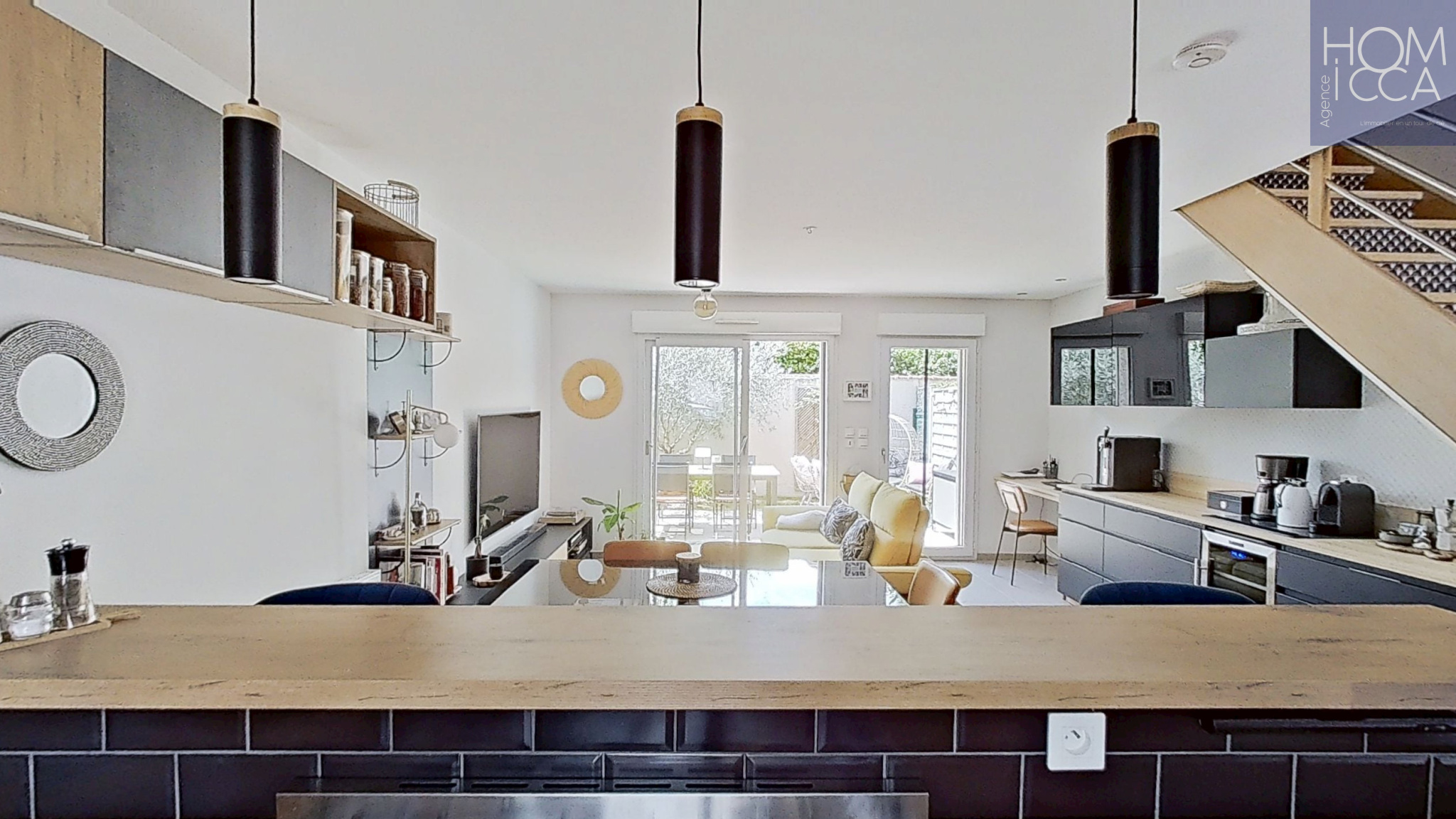 Traversant SUD-OUEST / NORD-EST, il est lumineux, et se compose de plain pied d'une entrée donnant sur une grande pièce de vie de près de 39 m² réunissant salon-séjour et cuisine entièrement équipée (piano de cuisson SMEG), d'un WC avec espace buanderie et lave-mains. Le tout ouvrant directement sur un espace extérieur de 25 m² avec une terrasse et son petit jardin privé. Exposition SUD-OUEST avec store banne électrique, électricité et lumière.